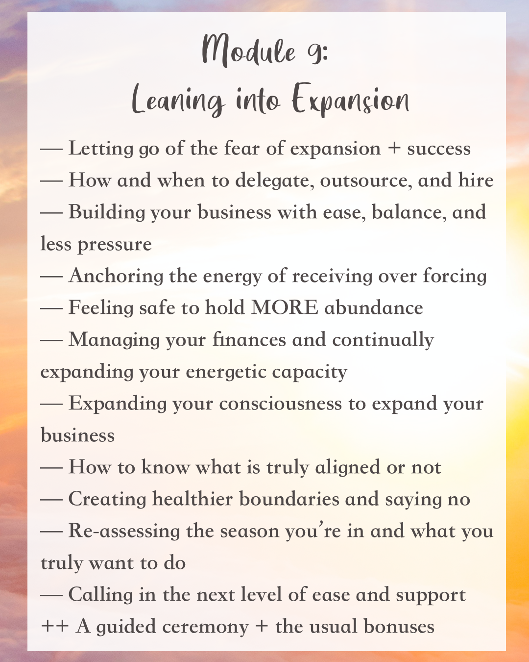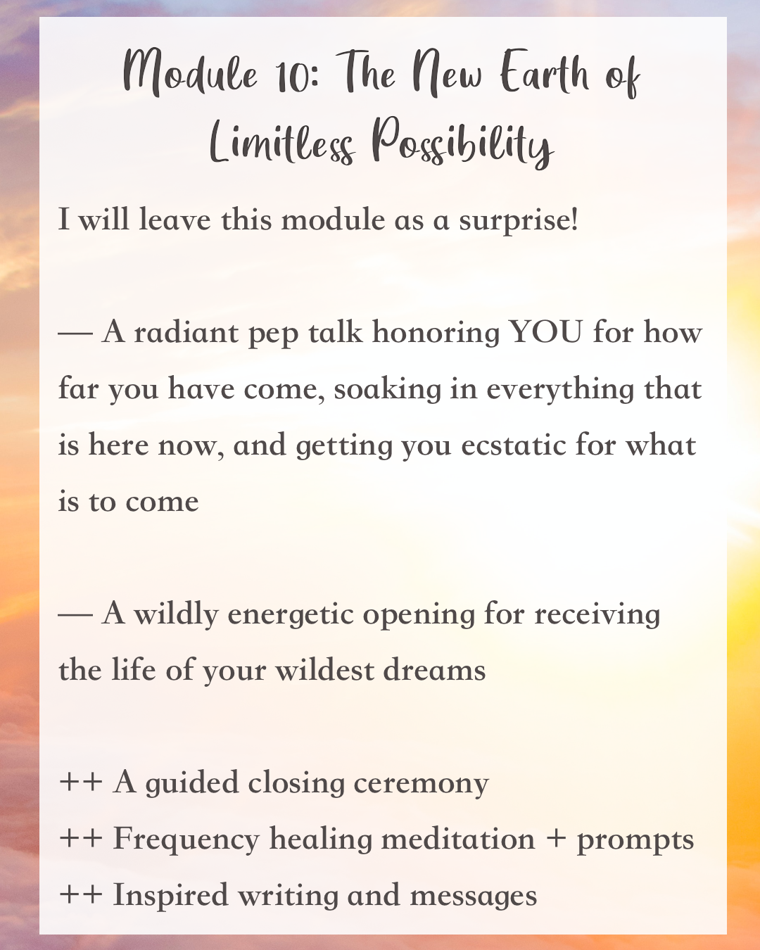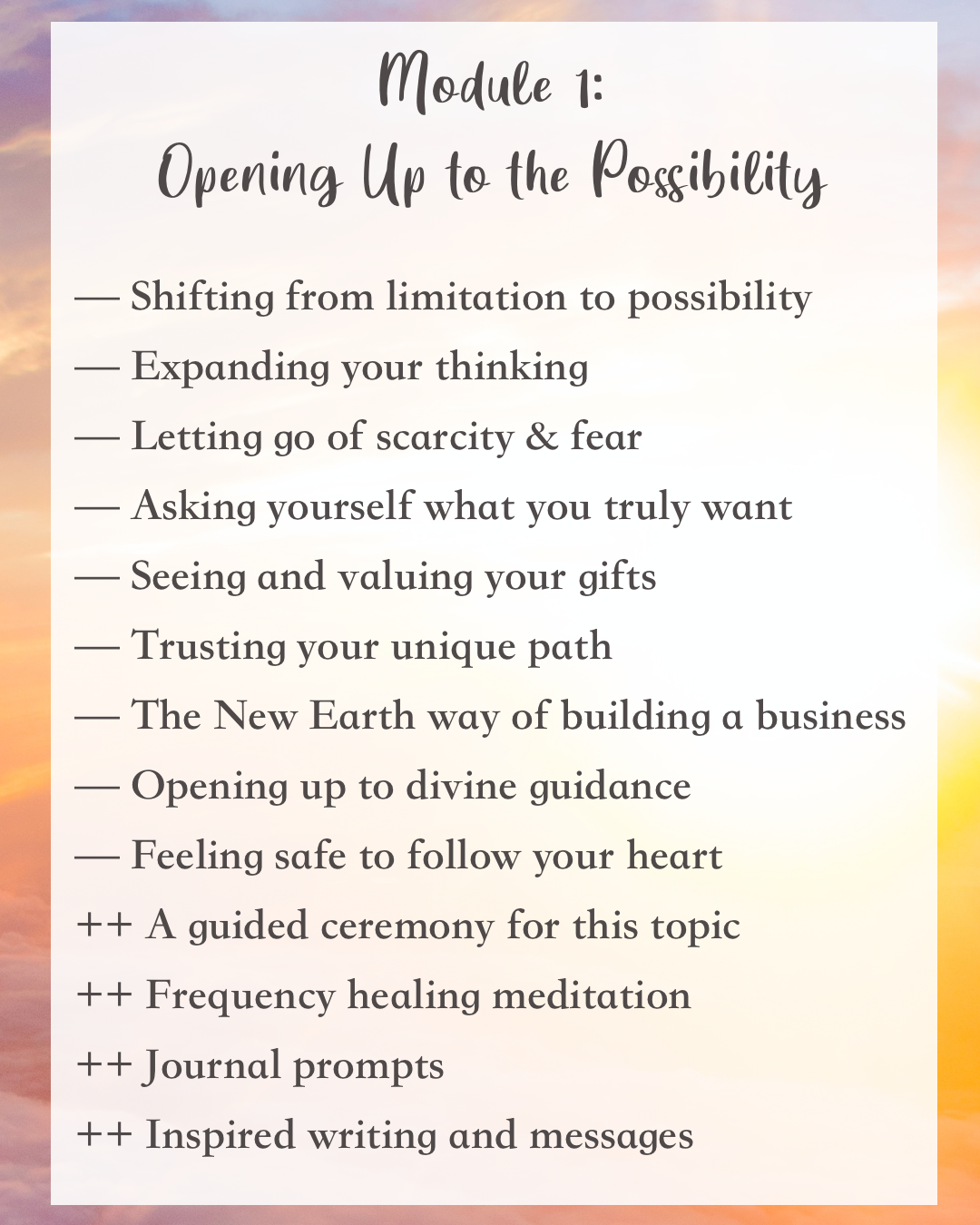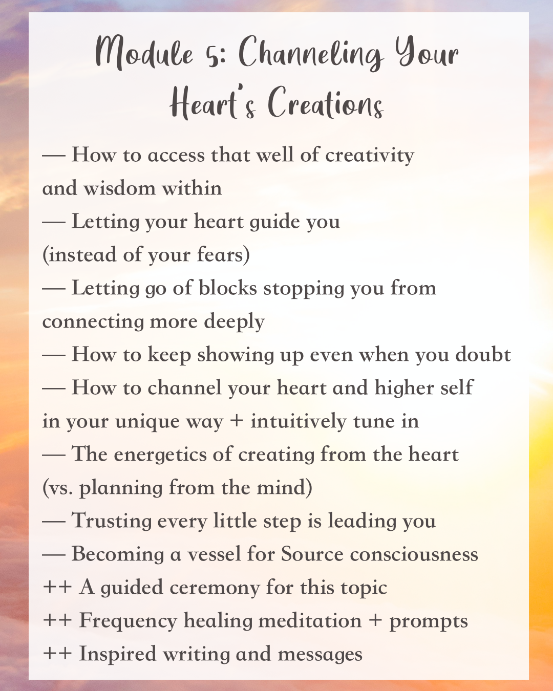 These modules are built to deeply support you ~ so you can do them at your own pace. The intention is for you to relax and RECEIVE inspiration, clarity, and ease... to get out of the mental overwhelm and into the infinite space of the heart.
