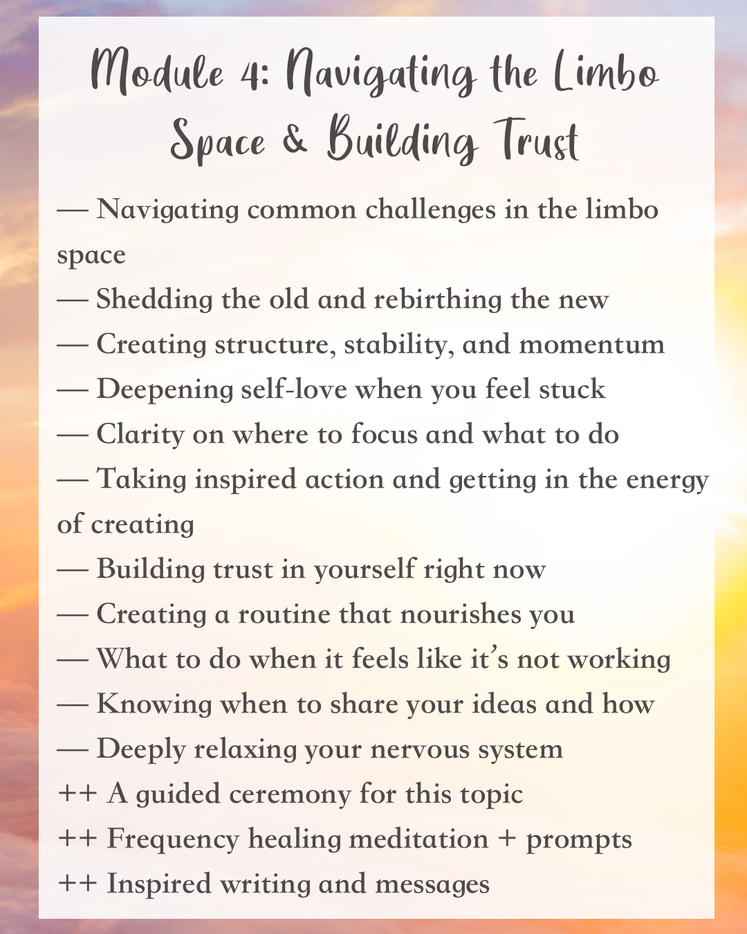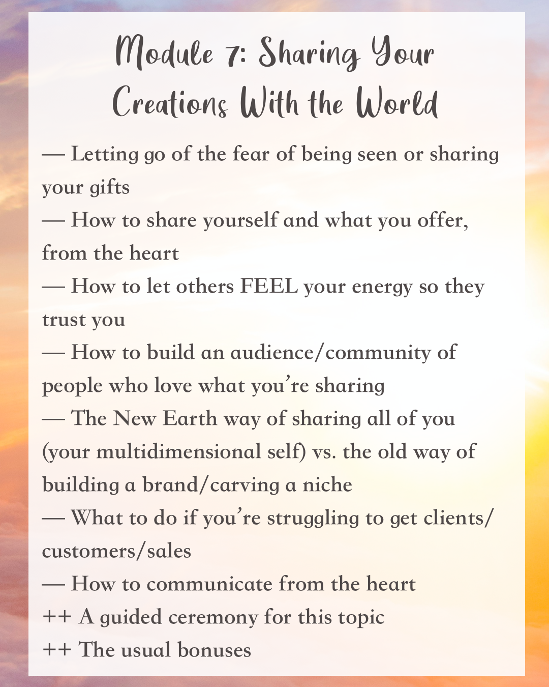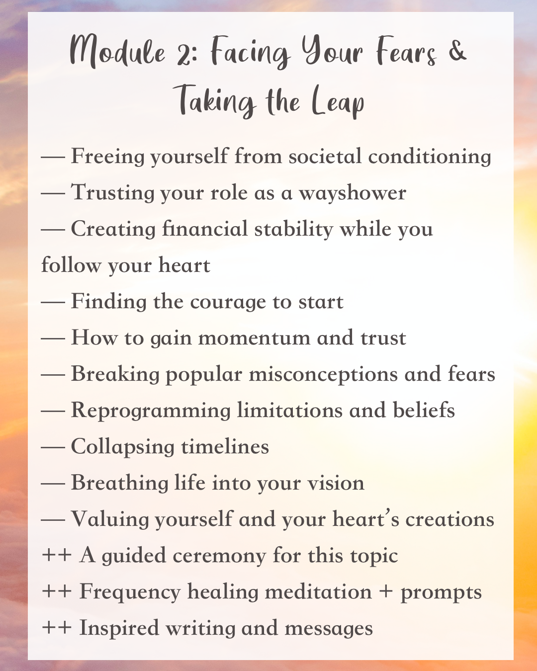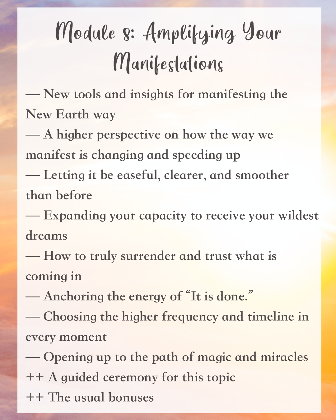 "I just finished module 4 and I've been feeling like I'm remembering the future... if that makes sense at all! I have so much more trust in my path already and know your course is playing a key role in this other-worldy remembering."
