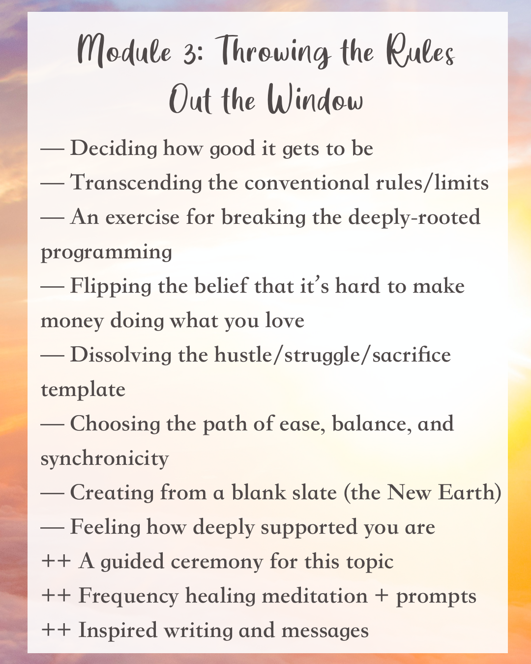 - To give yourself permission to create in a way that feels easeful and exciting for you (breaking the old paradigms of sacrifice, hustle, and struggle)