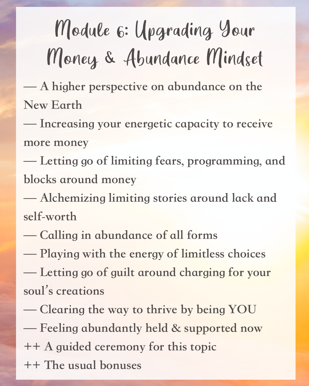 — A pre-recorded guided ceremony tailored to the module topic, to help shift fears/blocks, clear your energy, open you up to receiving clarity and guidance, and call in your highest timeline